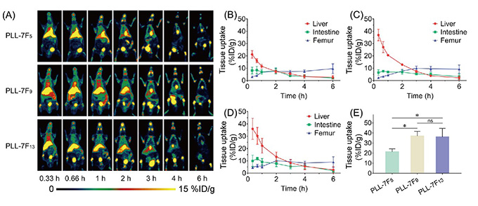 进一步研究发现,放射性核素18F可以通过卤素置换反应在氟化PLL(F-PLL)上进行标记,标记后不改变其化学结构及生物活性。PET显像显示,氟化修饰的PLL在肝脏中可以快速清除,其肝脏摄取率随氟链修饰数量从5增加到9而有所升高,但是当氟链修饰数量分别达到9和13的时候肝脏摄取率几乎没有差别。