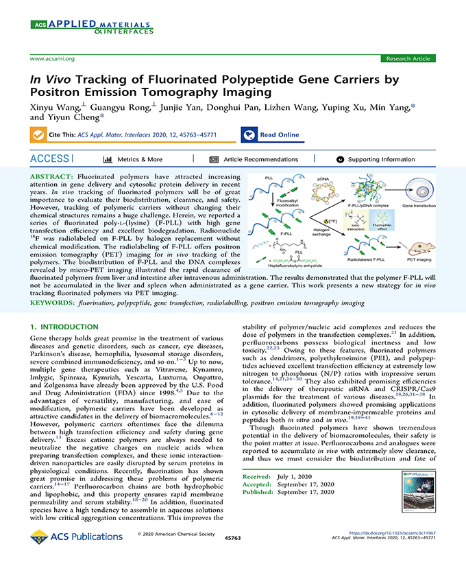 我所分子影像中心杨敏研究员团队与华东师范大学程义云教授等合作,首次利用正电子发射断层扫描成像技术(PET)对含氟多肽基因载体进行了活体、动态示踪。近期,这一研究新成果发表在工程技术类一区期刊《ACS Applied Materials & Interfaces》上。